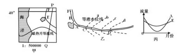 例:甲图中PQ为晨昏线,乙图是甲图中的对应河段及其附近的等潜水位线图,丙图中的年径流量曲线图是从乙图中A、E两处测得的,读图回答12~13题