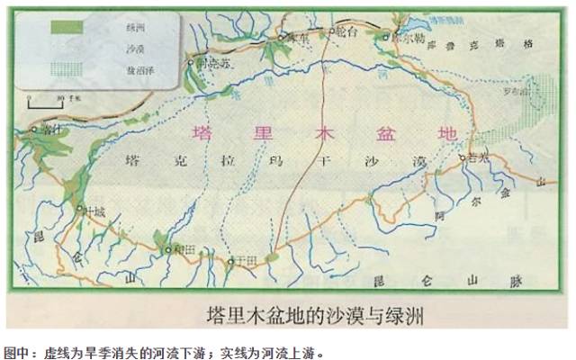 时令河即季节河,这类河流主要分布于内陆沙漠或沙漠边缘,是雨季时雨水汇流成河,一般越向下游水量越少,在旱季时流量变小甚至干涸只留河床,随季节消失的部分在地图上用虚线画出。我国著名的时令河是塔里木河,位于新疆塔里木盆地塔克拉玛干沙漠内。河流由实线向虚线流。