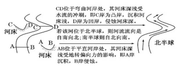 在河岸弯曲处,由于受水流的冲刷,凹岸河床较深,而凸岸往往形成河漫滩,即河床较浅;在河岸平直处,由于受地转偏向力的作用,北半球右岸河床较深,左岸则较浅,南半球正好相反。