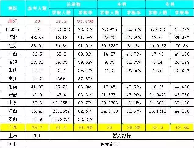 总录取率较高的省市依次是:内蒙古、浙江、江苏、河北。这些省份的总录取率已经超过了90%。一的竟是今年首次新高考的浙江,录取率高达93.79%,这是否说明未来采用新高考,录取率会越来越高呢?